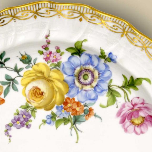 im Mittelpunkt des Tafelservice Dresdner Porzellan Blume Leicht. Diese Spezialität der Dresdner Blumenmalerei erkennen Sie an der Farben- und Formenvielfalt. Das Dekor Dresdner Porzellan Blume Leicht verzichtet auf einen großen Teil des üppigen Goldzierrats, den Sie bei dem Dekor Blume Golddekor finden.